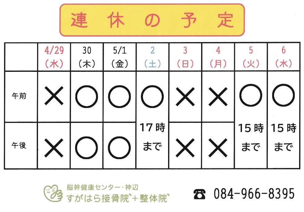 ゴールデンウィーク。 2026/04/25 新学期が始まり 3週間が経過しました。 新しい環境がスタートした方はもう慣れましたか? 疲れが出ている方、疲れが抜けない方、どこか痛みがある方・・・早めに施術にお越しくださいませ。 ゴールデンウィークの予定が決まりましたのでご確認お願い致します。 すがはら接骨院+整体院 太占数霊鑑定家・ライフナビゲーター 菅原 亘哉尚 084-966-8395